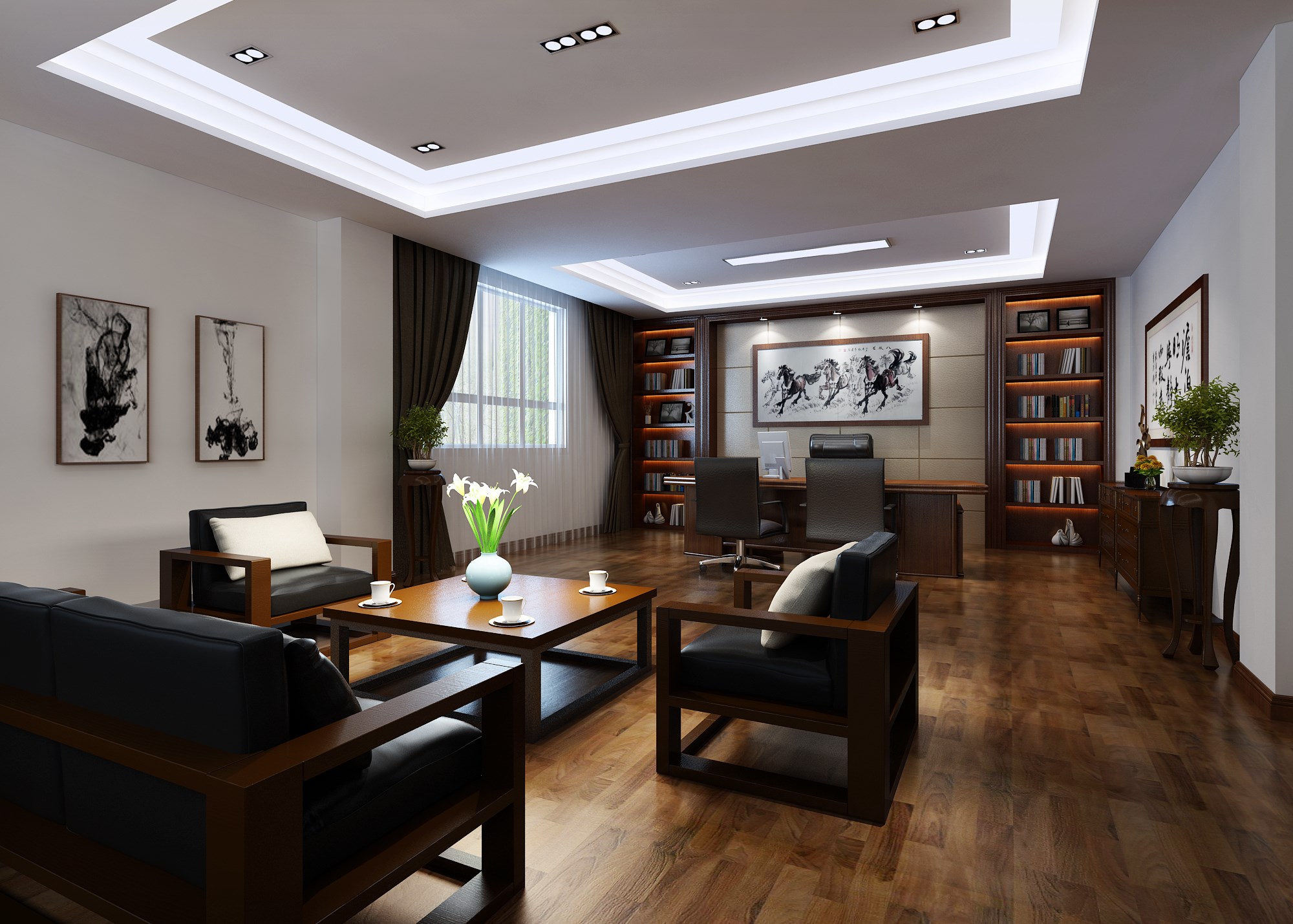 淺灰色和白色的墻壁與深色木質(zhì)地板優(yōu)雅而和諧地結(jié)合在一起,為整個空間增添了一種高雅而專業(yè)的氛圍。設(shè)計(jì)師在辦公室的裝飾上注重細(xì)節(jié),用綠色植物和現(xiàn)代藝術(shù)品的裝飾點(diǎn)綴,使整個空間更加生機(jī)和活力。